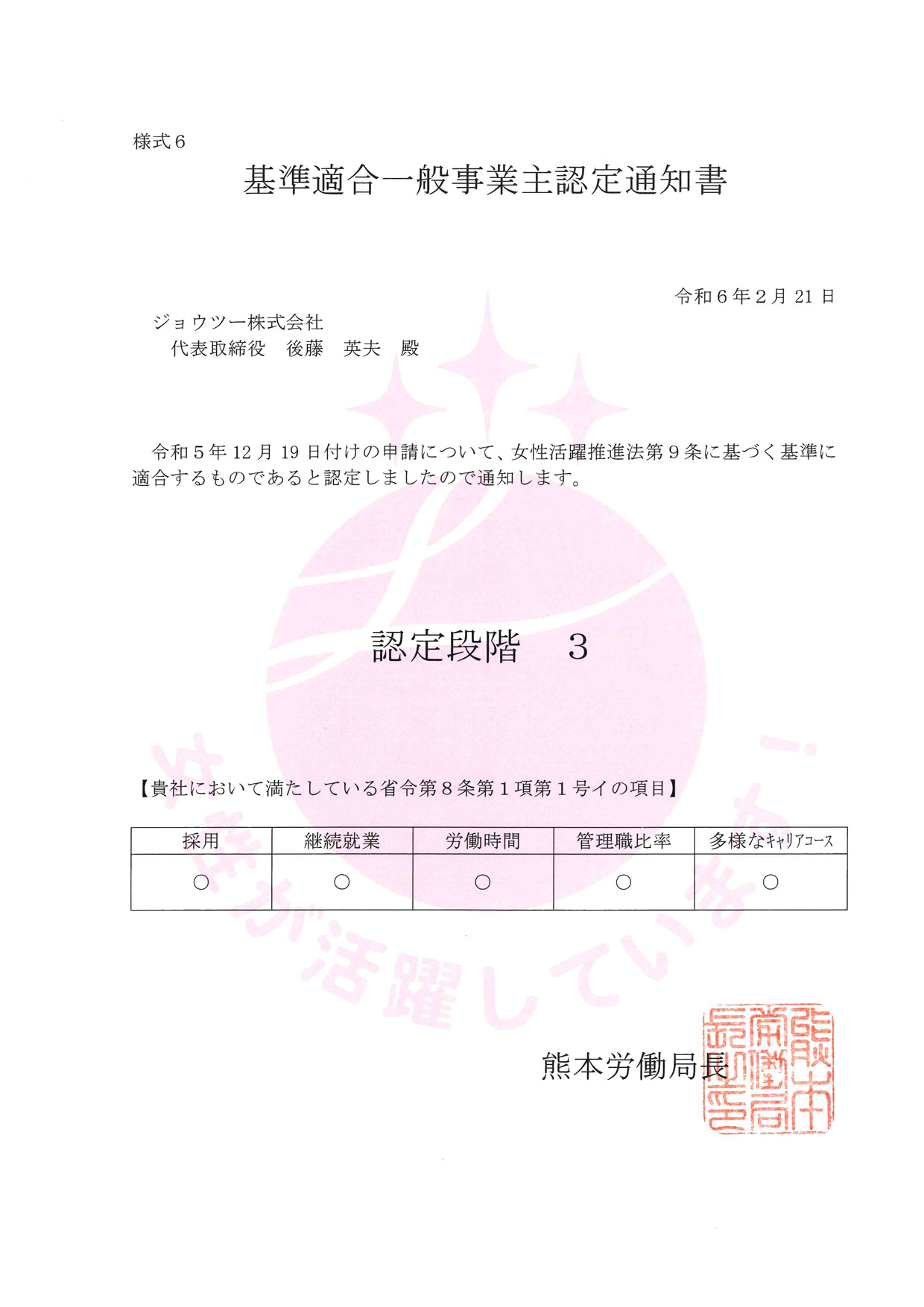 当社は、熊本労働局より令和6年2月21日付けで、熊本労働局より女性活躍推進法第9条に基づく基準に適合、5つの基準全てを達成し、3段階のうち最も高いえるぼし認定段階3の