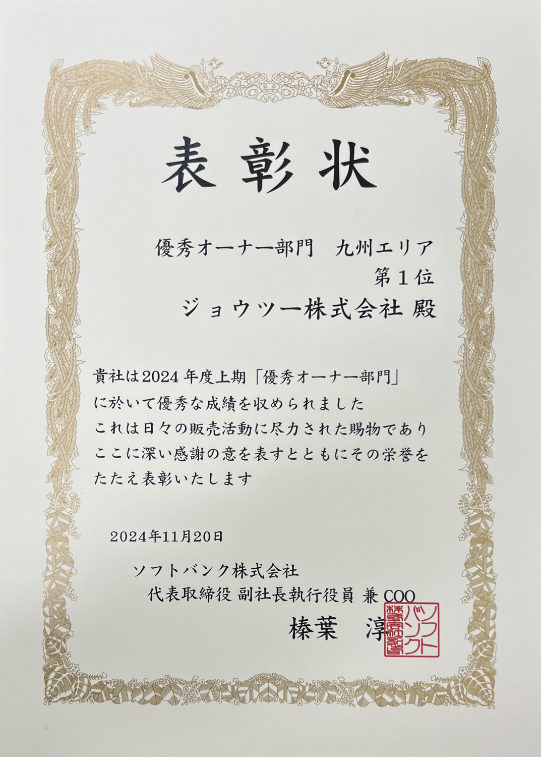 ソフトバンク2024年度上期実績において、九州地区の優秀オーナー部門でも1位を獲得、表彰されました。これからもお客様に寄り添い地域No.1のお店を目指します。