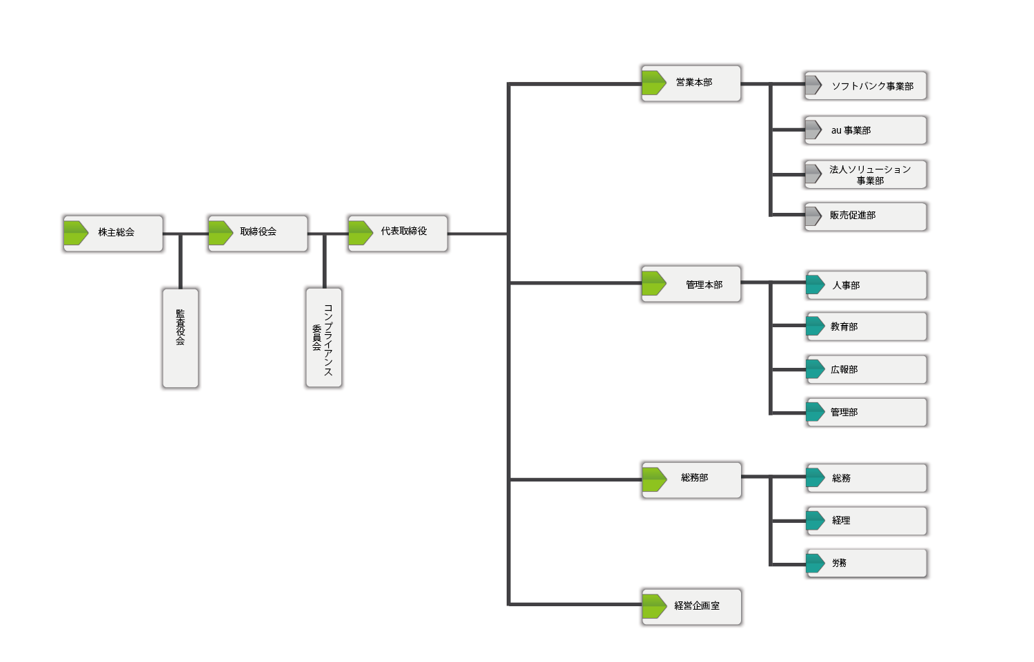 当社は、モバイル通信サービスの代理店として、ソフトバンク・Y!mobile・auのキャリアショップ運営と法人向けソリューション提案を行う通信サービス企業です。